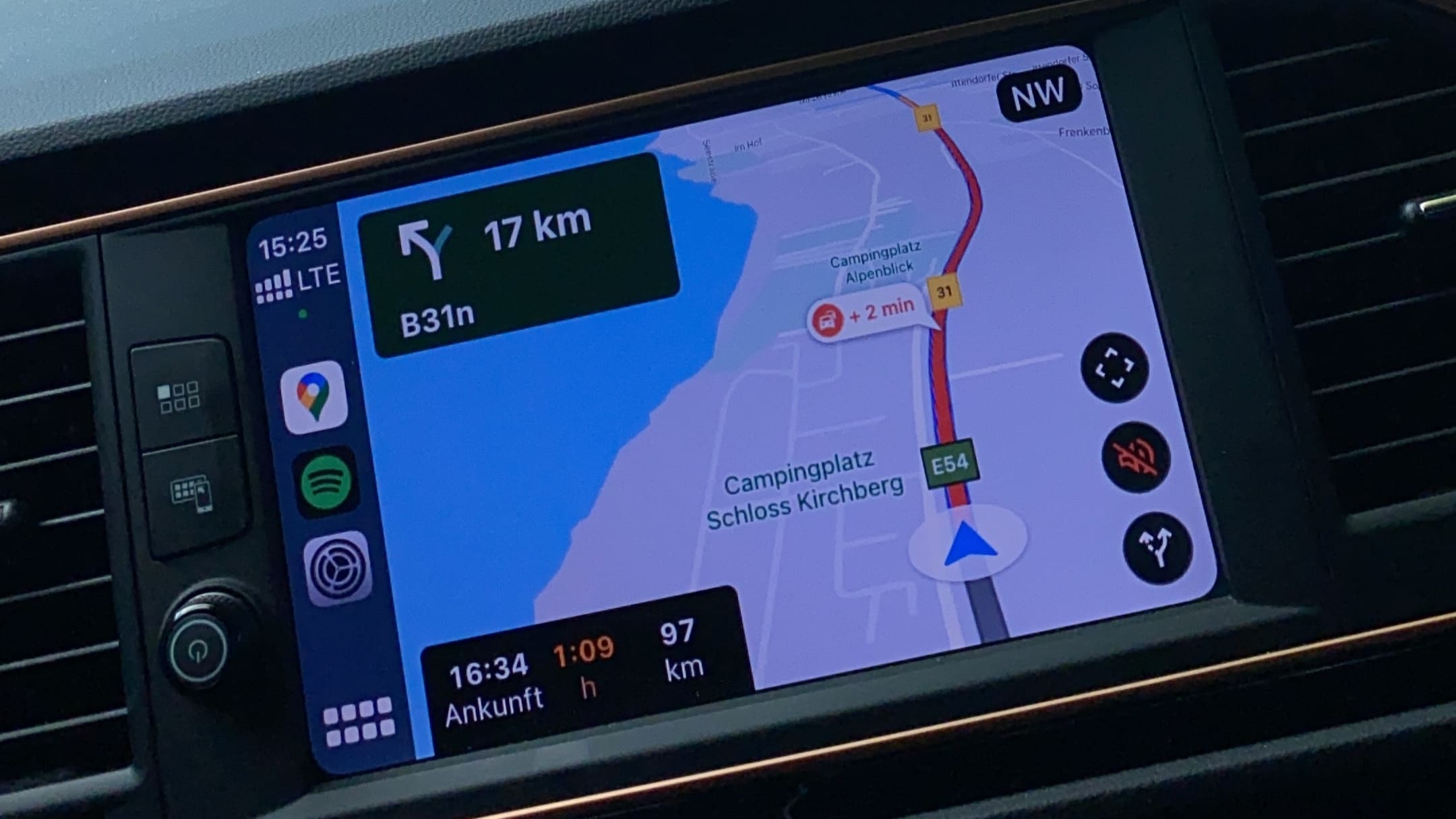 Ins Auto einsteigen, den Motor starten und innerhalb weniger Minuten ist das iPhone direkt mit dem Wagen über Carplay verbunden.